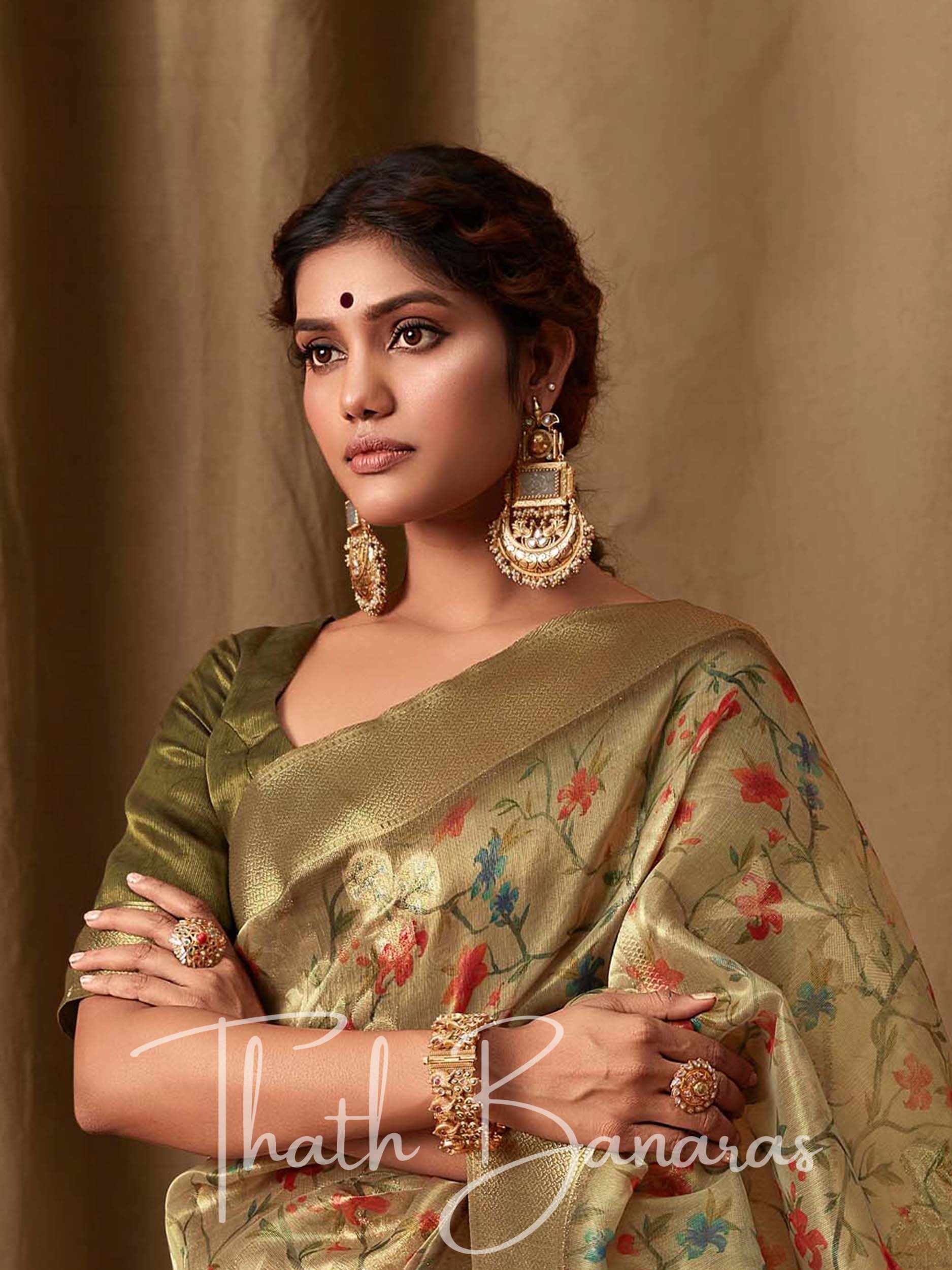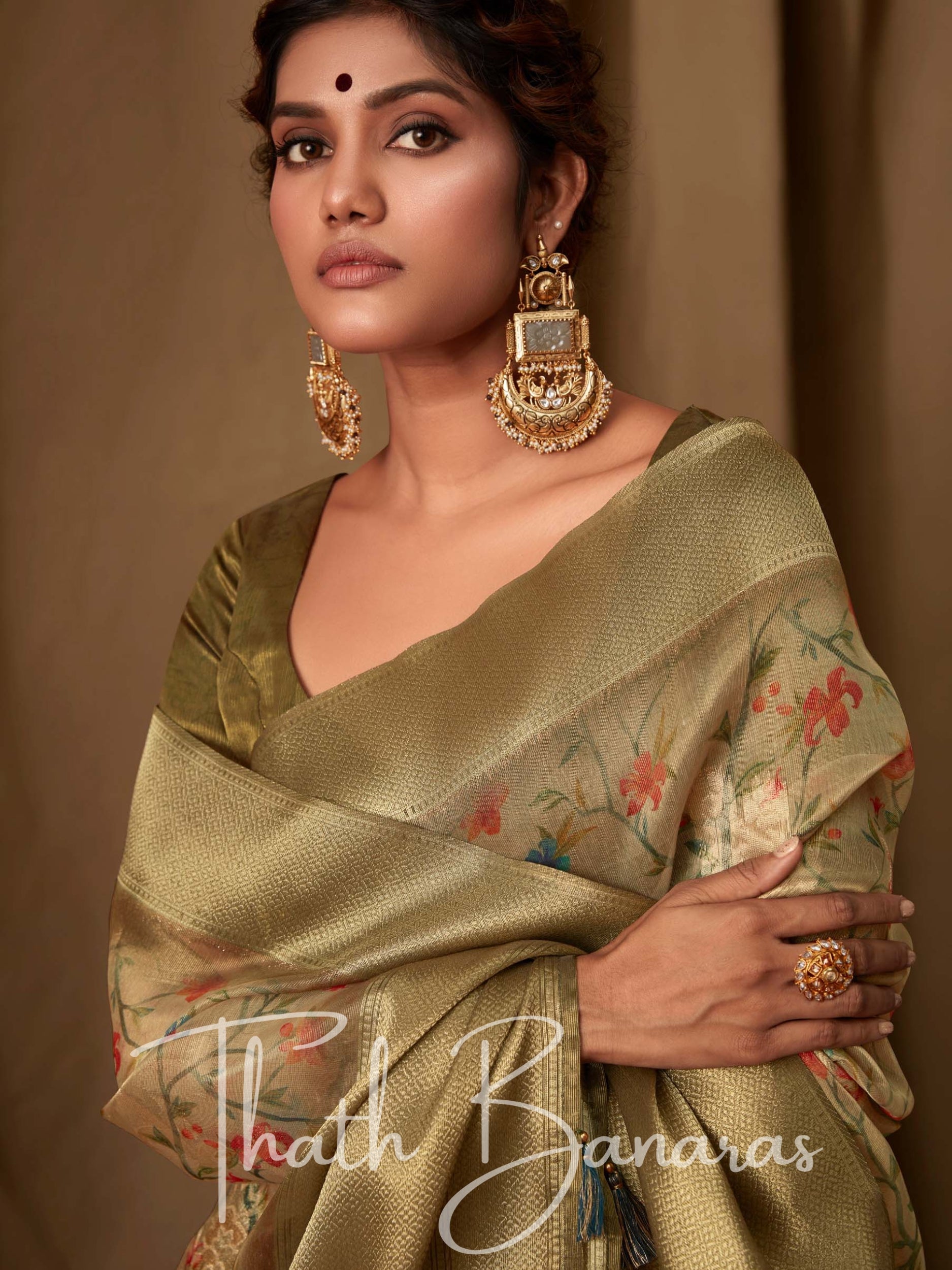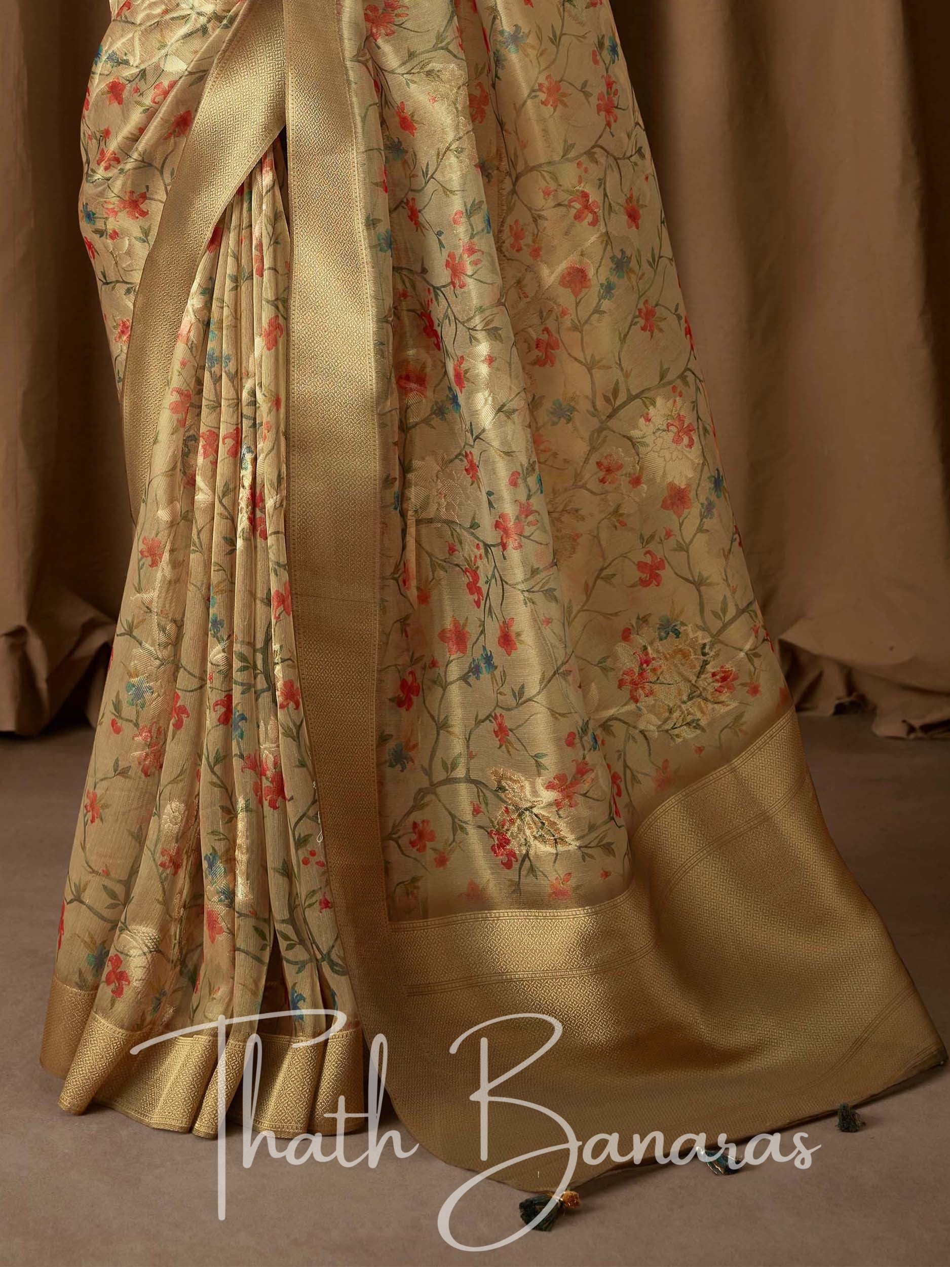 Antique Gold Banarasi Jacquard Tissue Silk Saree with Zari Work
