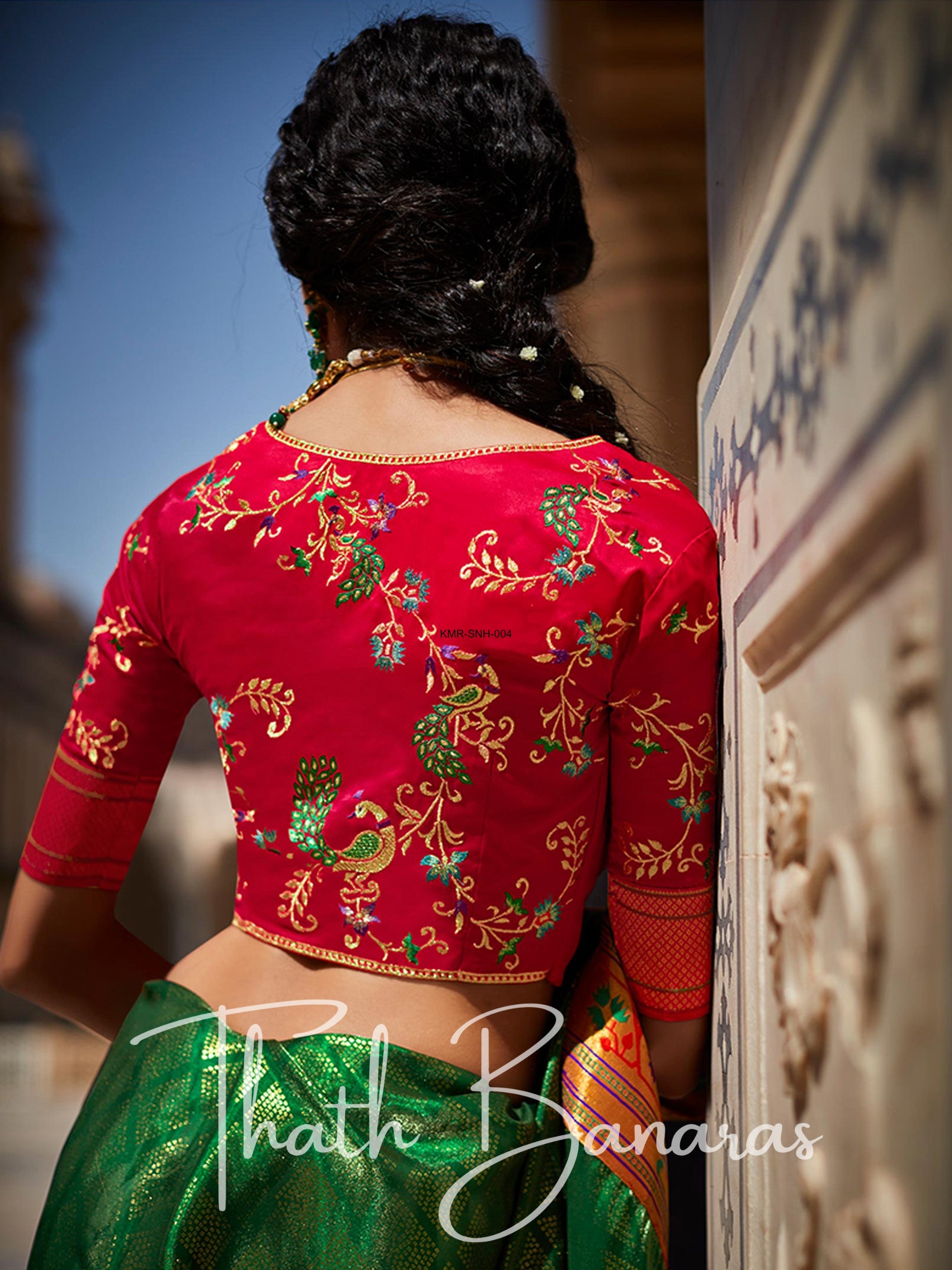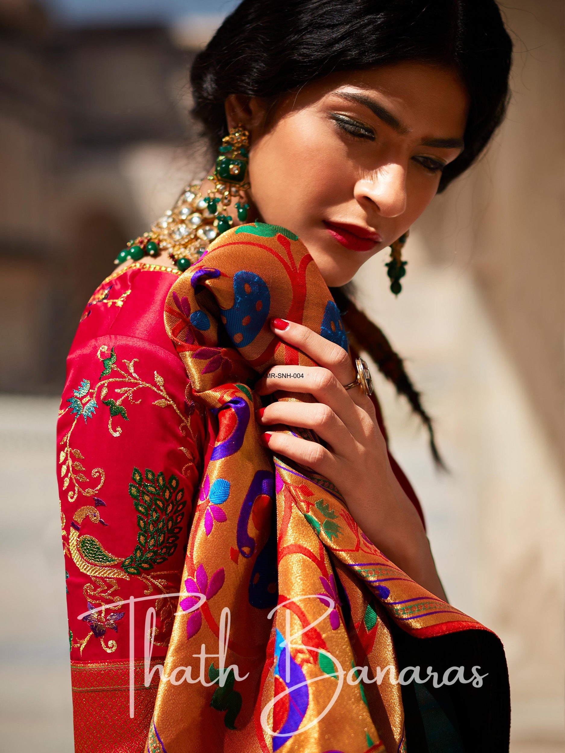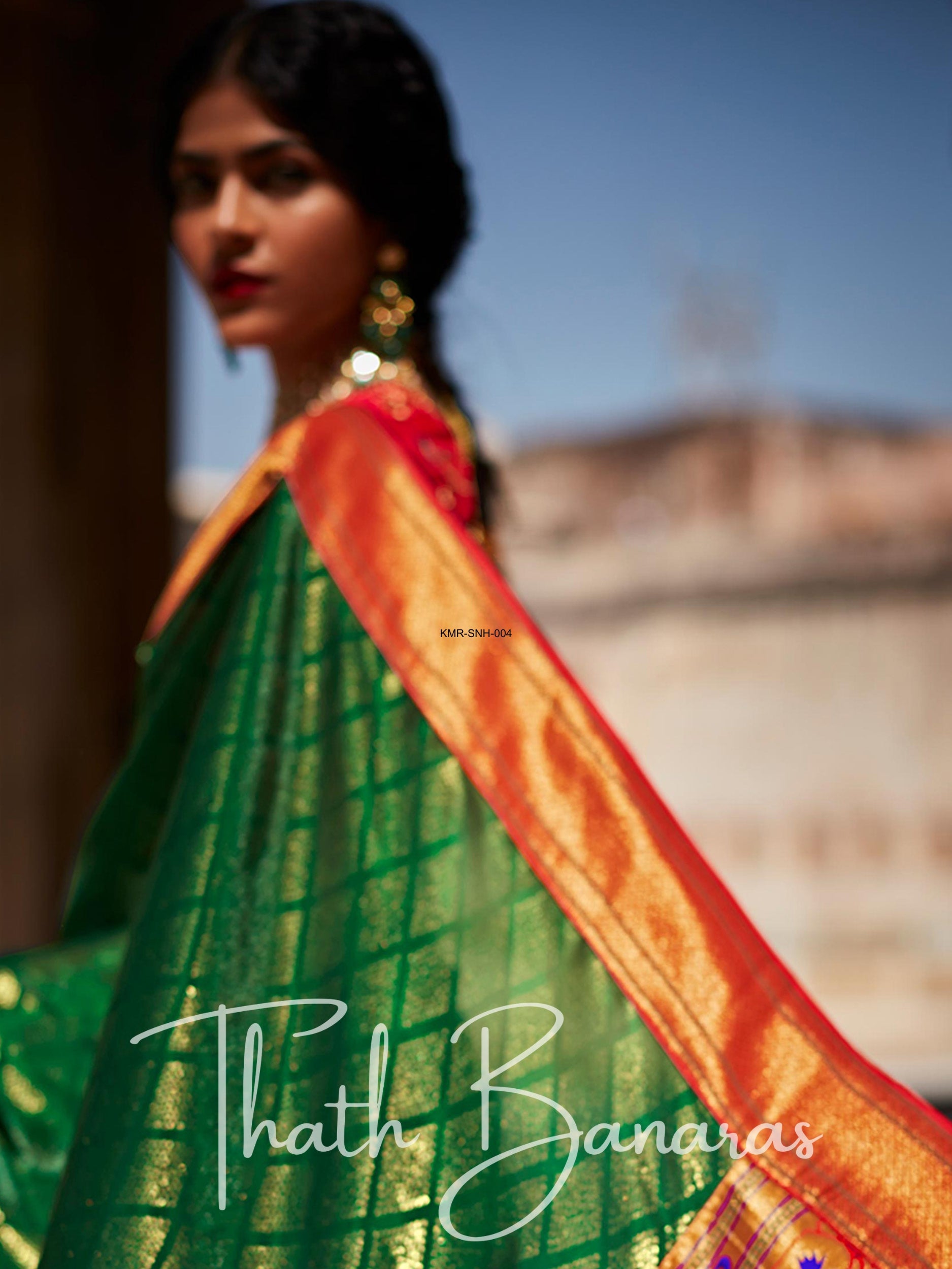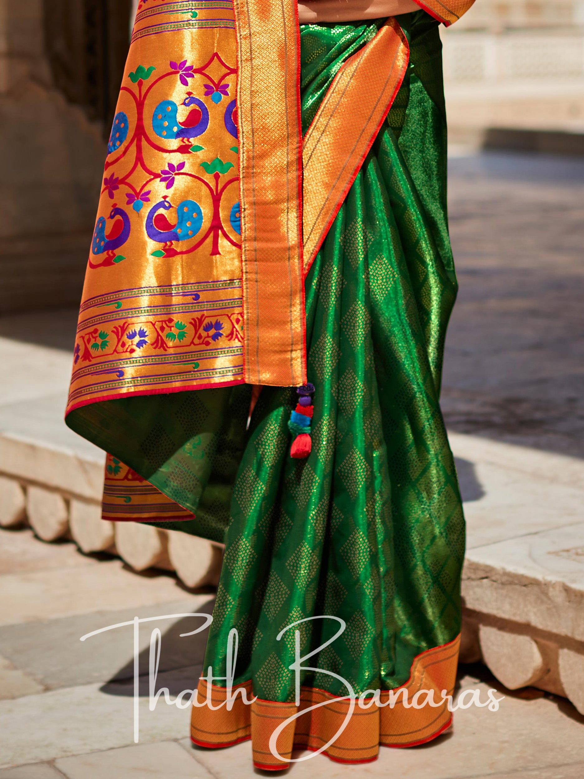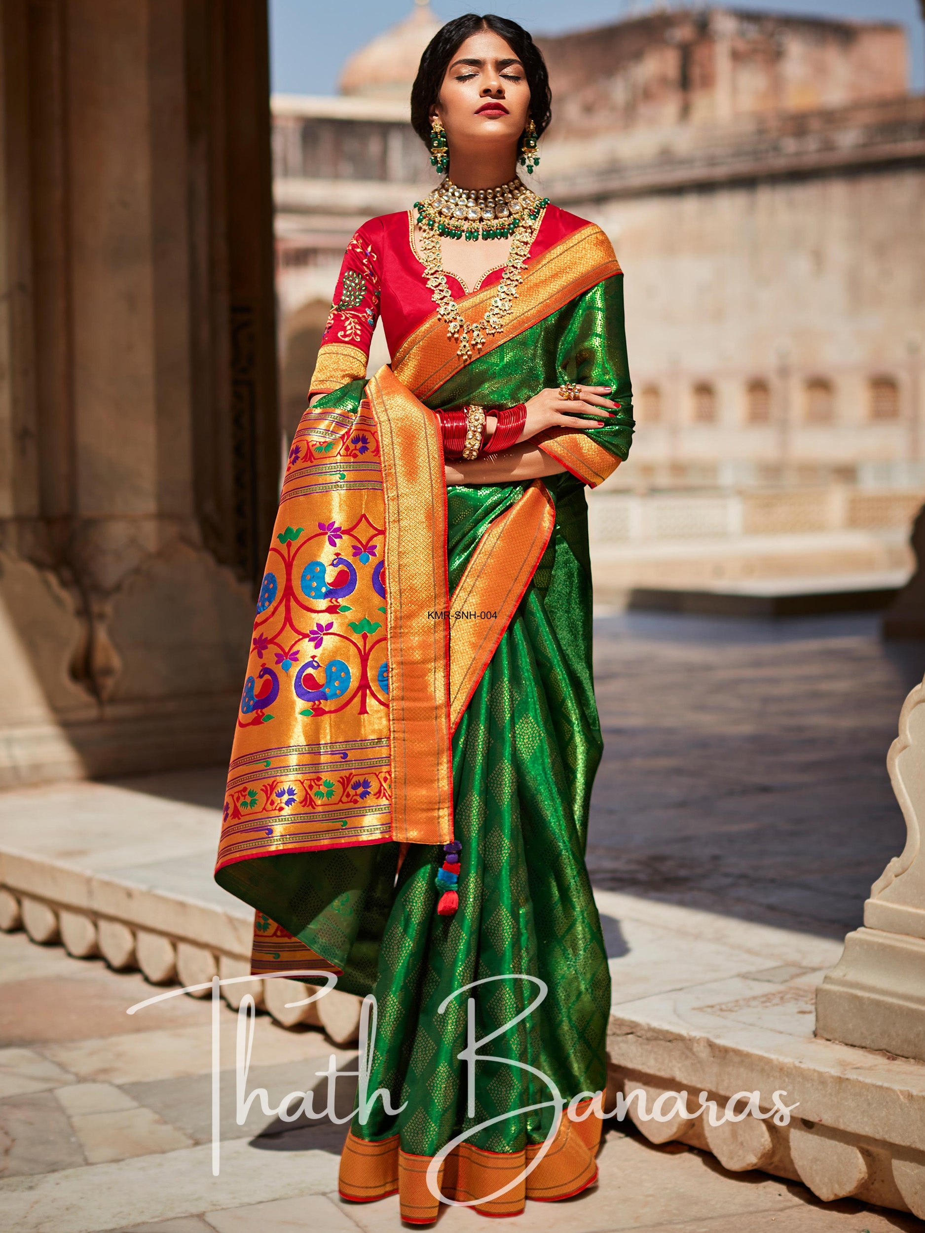 Green Paithani silk sarees are a refreshing and elegant choice for any special occasion. The green color is associated with nature, renewal, and calm, making it a perfect pick for a spring or summer event. The luxurious Paithani silk fabric adds a touch of opulence and glamour, making you feel like a queen. The intricate weaving technique gives the saree a unique texture and character, adding to its charm and exclusivity. Paithani sarees are a traditional and highly prized form of saree from the Indian state of Maharashtra, and are known for their fine and intricate zari work. A green Paithani silk saree is sure to make a statement and turn heads wherever you go. Its versatility allows you to style it with traditional or modern jewelry, making it a perfect addition to your wardrobe.