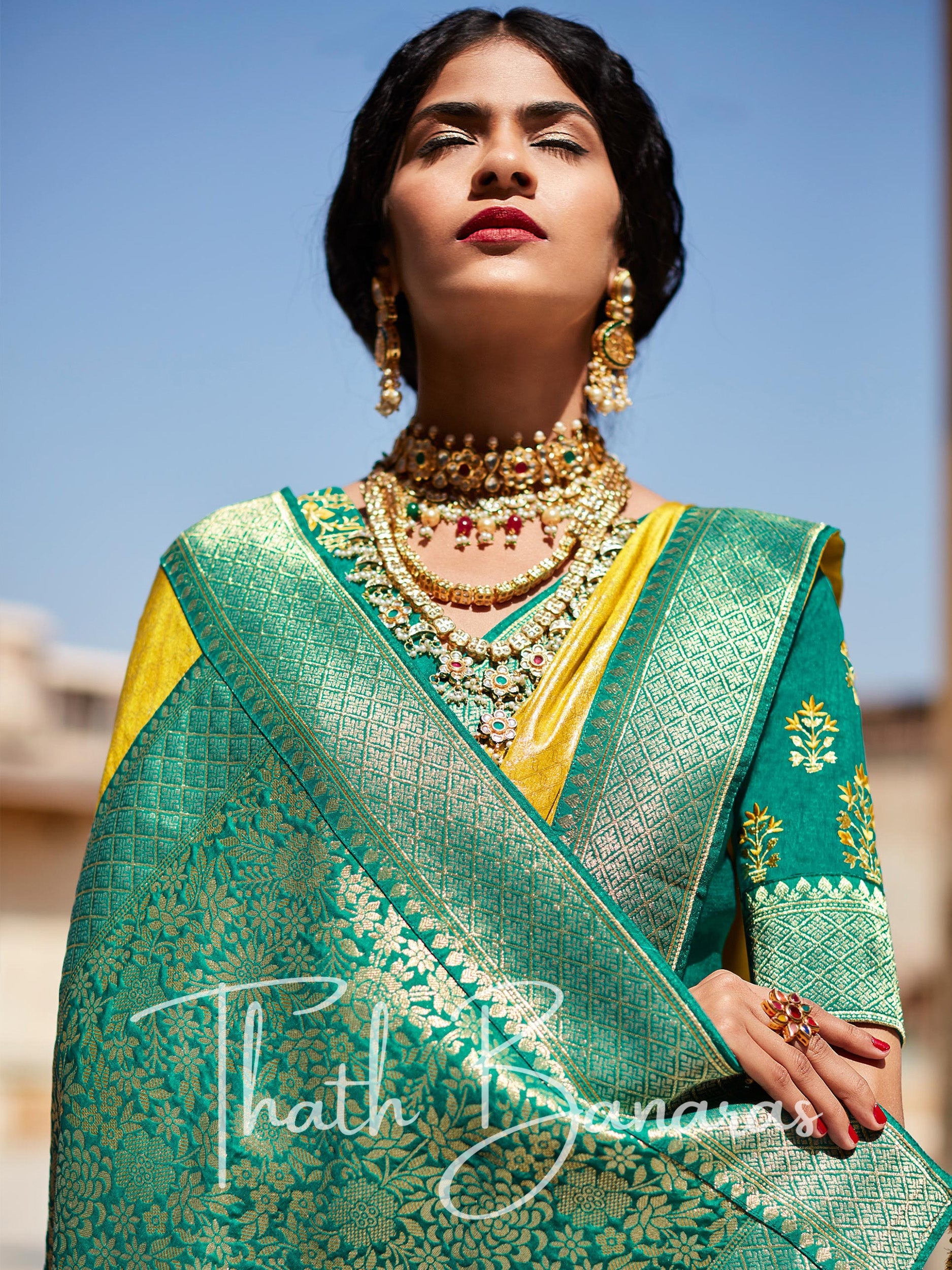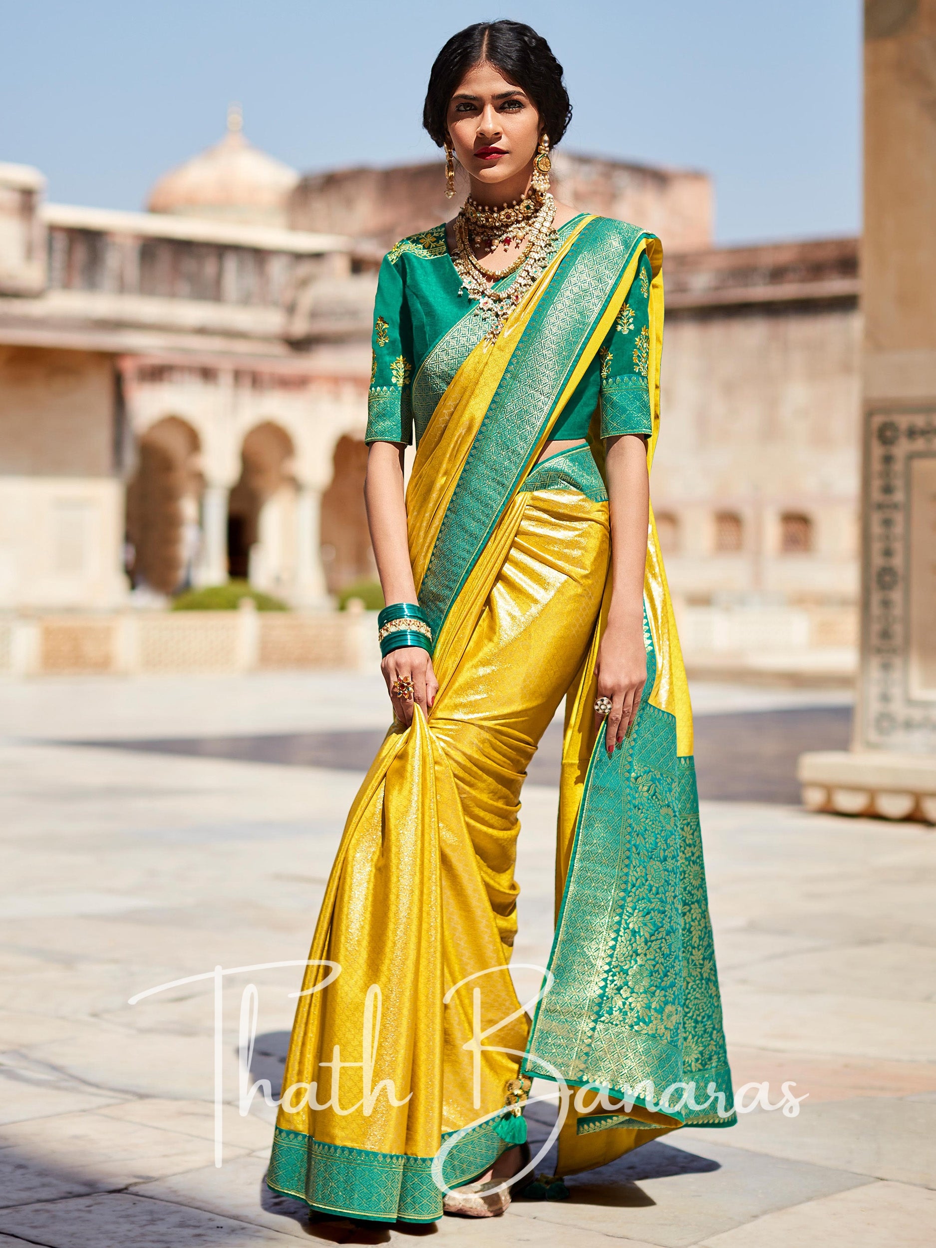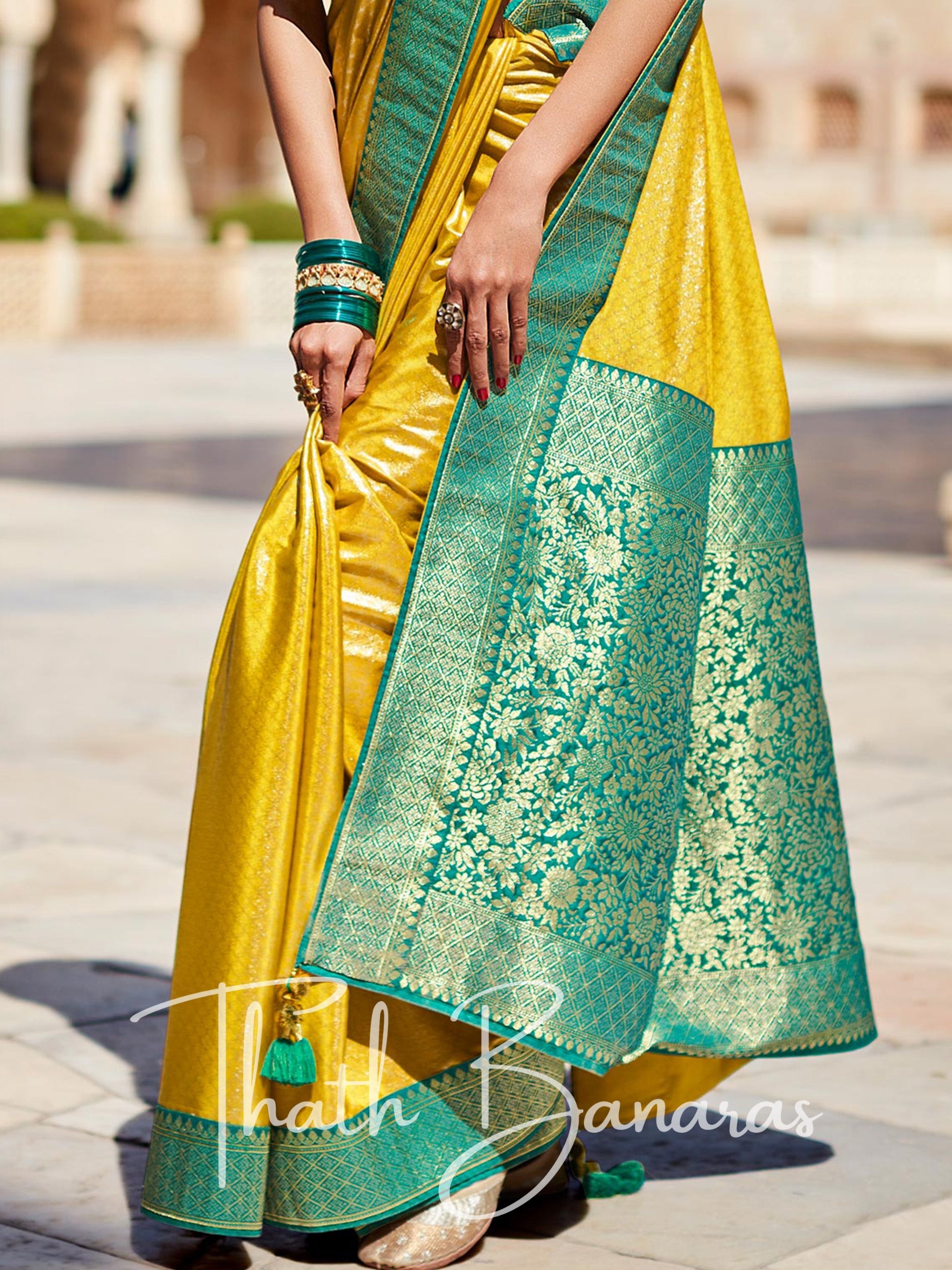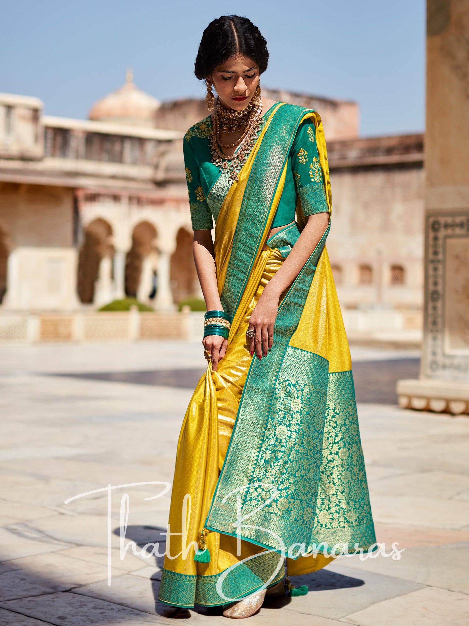 Yellow Paithani silk sarees are a cheerful and elegant choice for any special occasion. The bright yellow color is associated with happiness, optimism, and sunshine, making it a perfect pick for a summer event or a colorful celebration. The luxurious Paithani silk fabric adds a touch of opulence and glamour, making you feel like a queen. The intricate weaving technique gives the saree a unique texture and character, adding to its charm and exclusivity. Paithani sarees are a traditional and highly prized form of saree from the Indian state of Maharashtra, and are known for their fine and intricate zari work. A yellow Paithani silk saree is sure to make a statement and turn heads wherever you go. Its versatility allows you to style it with traditional or modern jewelry, making it a perfect addition to your wardrobe.