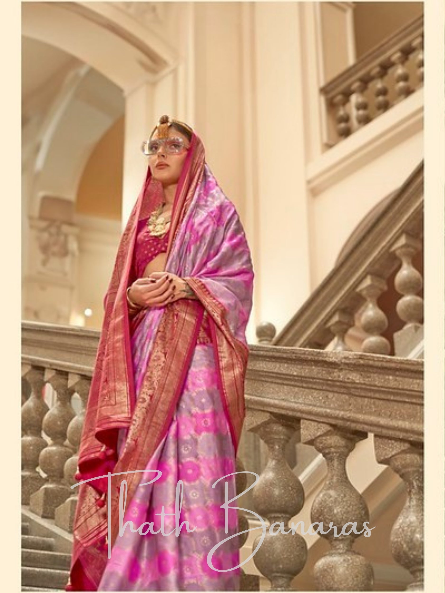 Embrace timeless elegance with this luxurious Gaji Satin Silk saree in a captivating pink hue. The saree features a stunning Rangat H.B. print, showcasing intricate detailing. Completing this ensemble is a Super P.V. Silk blouse in a harmonious shade, enriched with complementary zari work on its borders.