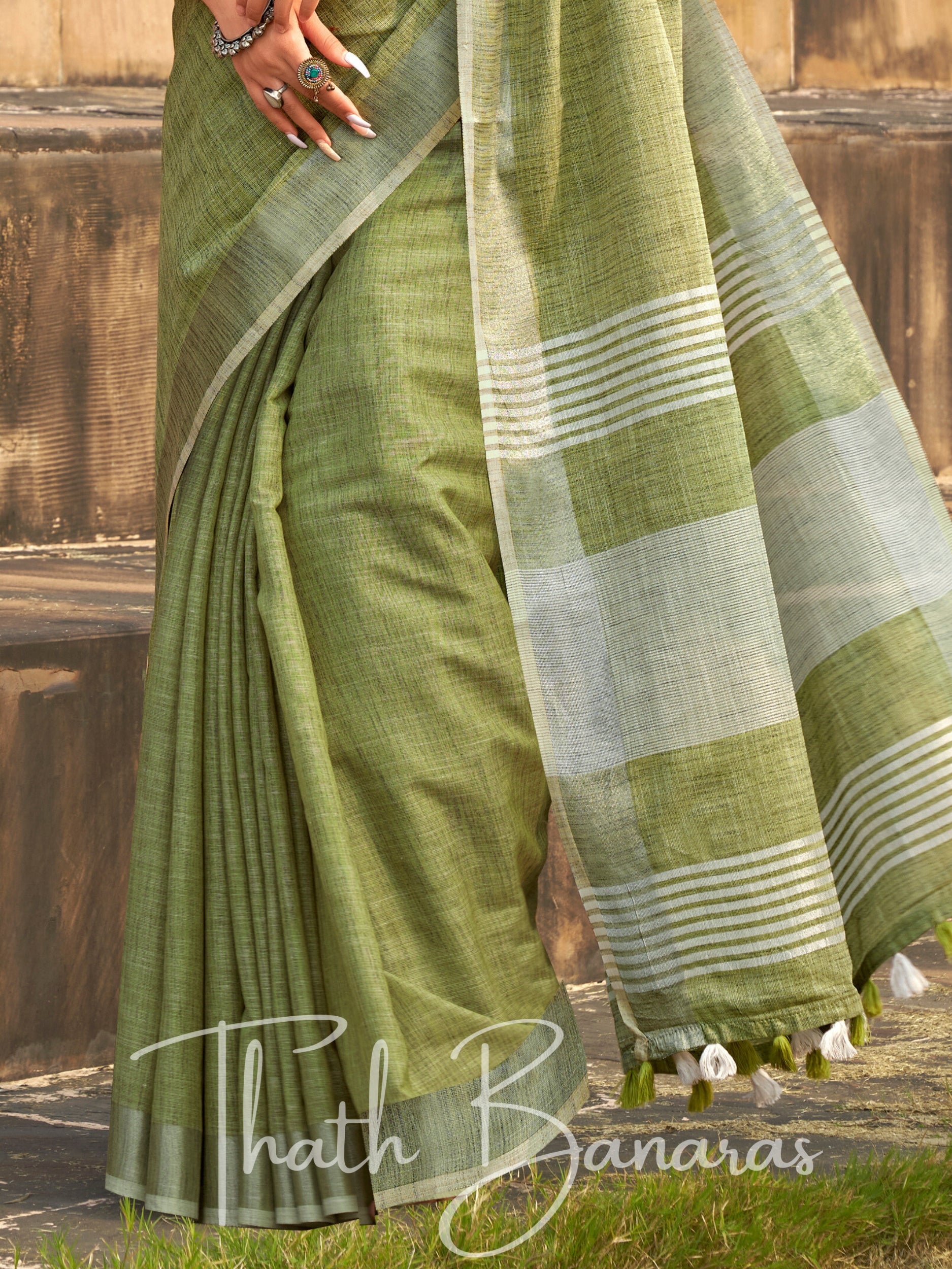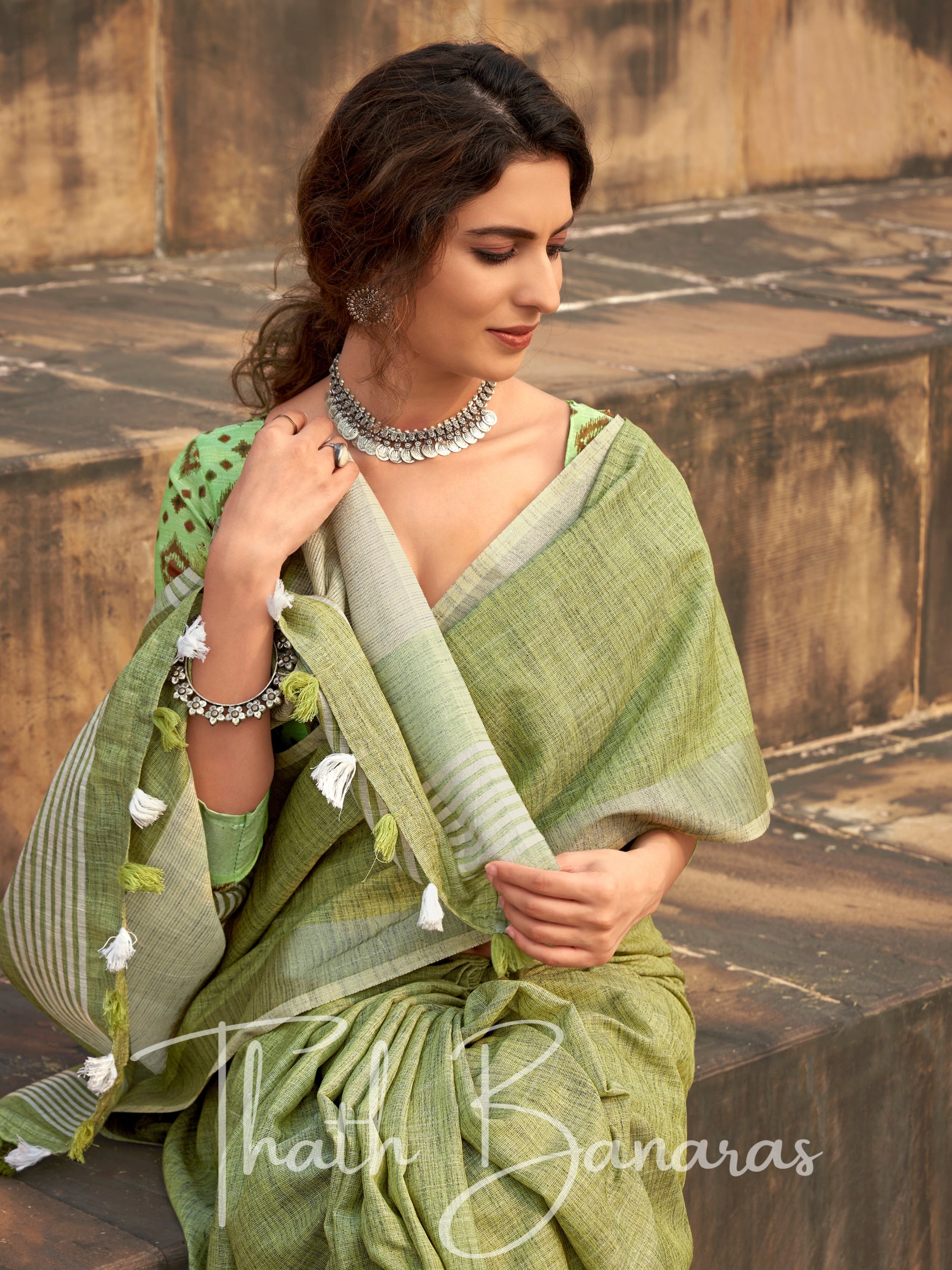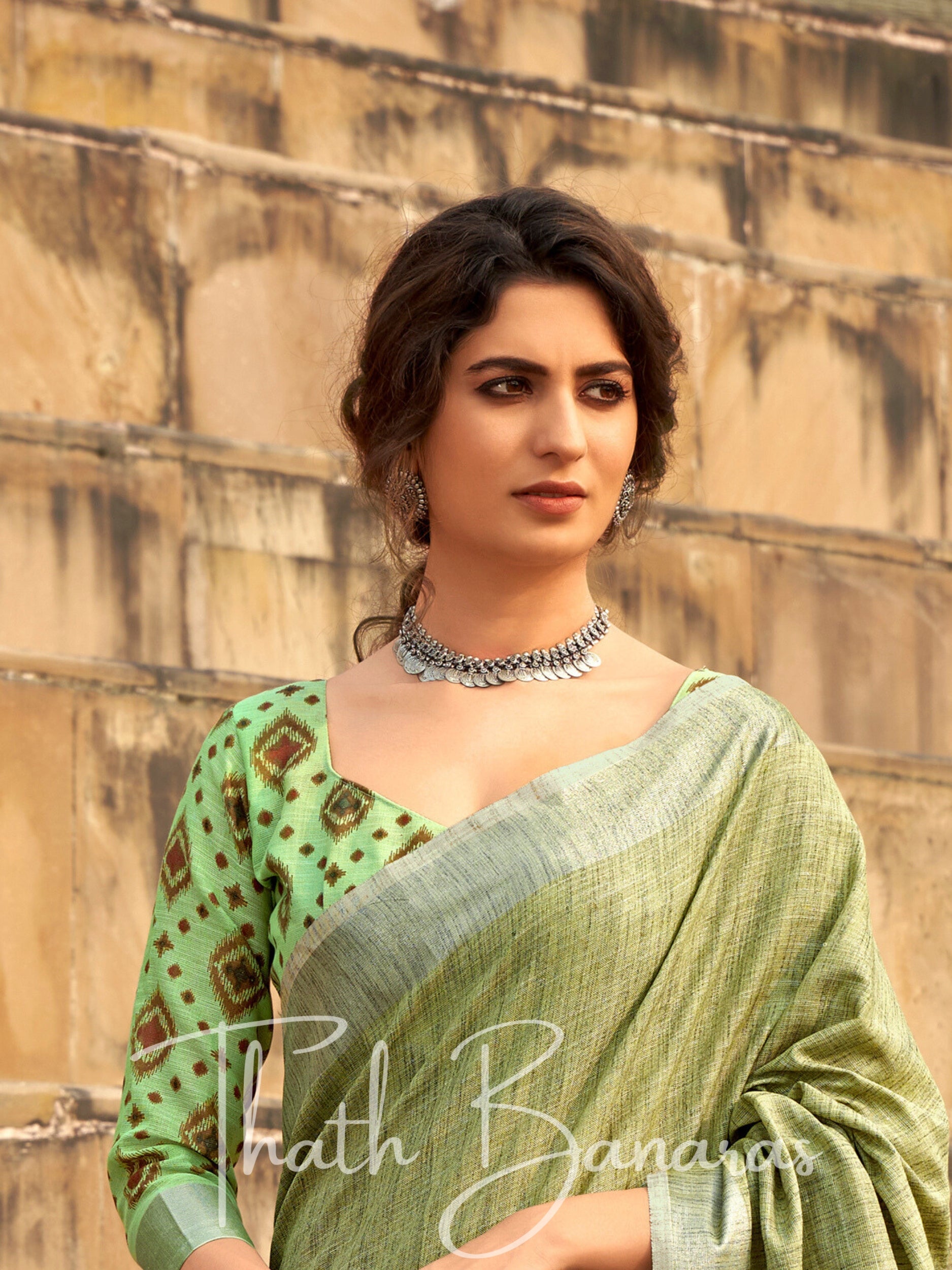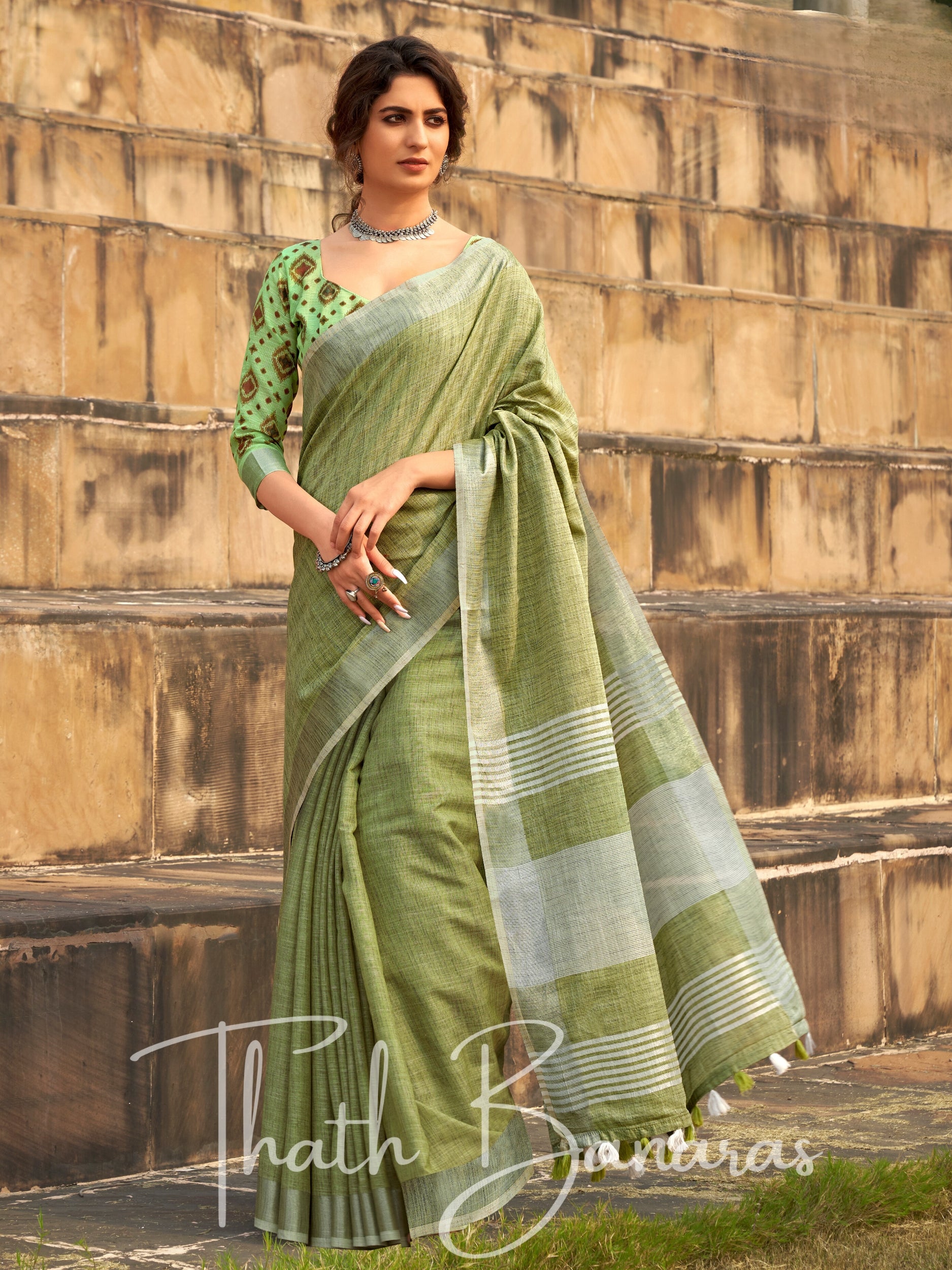 The soft linen silk with khadi print saree in pista green is a stunning choice for those who love vibrant and fresh colors. This saree is a beautiful blend of soft linen, silk, and khadi fabric. The khadi print adds a rustic and earthy touch to the luxurious feel of the silk and linen. The fabric is lightweight and breathable, making it perfect for warm weather. The saree drapes elegantly, making it a versatile choice for any occasion. Whether you prefer a traditional or modern look, this saree is sure to make you stand out with its unique blend of textures and patterns.