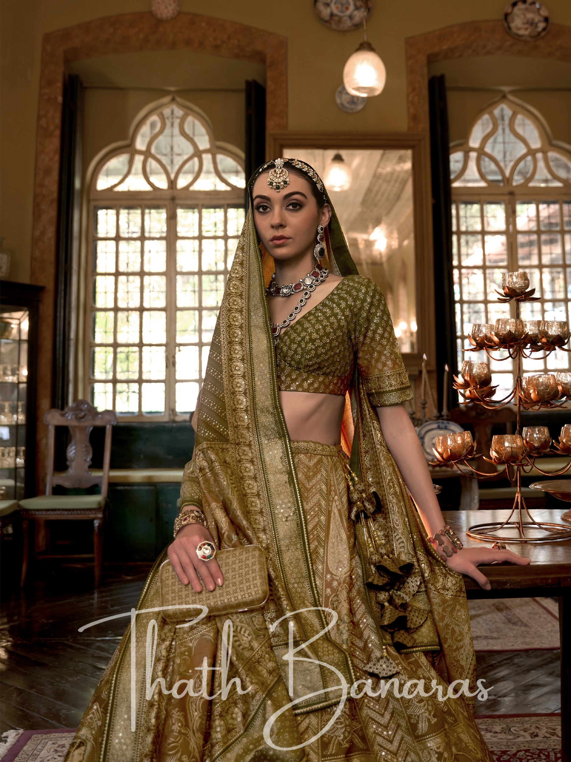 Embrace a touch of refreshing charm and calming serenity in this captivating lehenga. The smooth Rajwadi silk base in a captivating mehndi green hue evokes a sense of renewal and connection to nature. The intricate sparkle and mirror work add a touch of playful elegance and delicate charm, creating a look that is both graceful and effortlessly stylish.